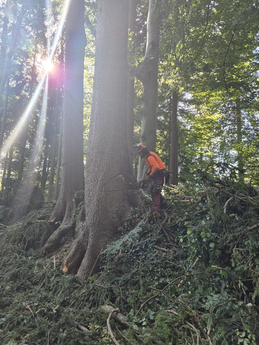 Präzise Fällung von Einzelbäumen oder Beständen – sicher, planvoll und unter Berücksichtigung des Bestandes.